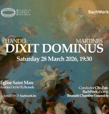 BachWerk and the Brussels Chamber Ensemble perform Dixit Dominus by George Friederick Handel, an extraordinary piece of music written in 1707 when he was living in Italy. Also on the programme, the lesser known and wonderful Dixit Dominus by Marianna von Martines, a baroque composer to discover, and Spring from Vivaldi’s Four Seasons.