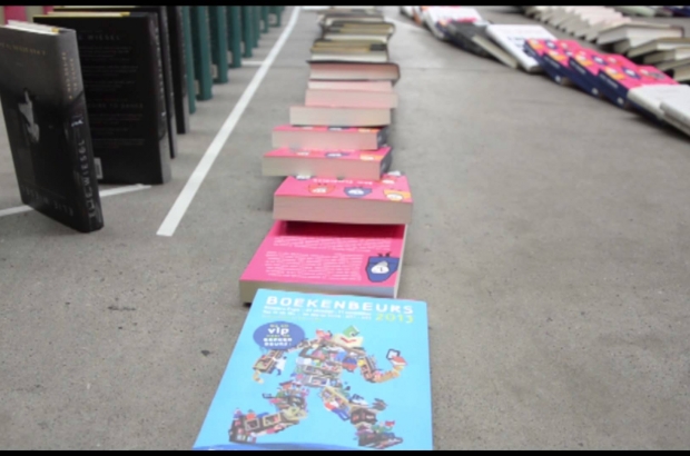 The largest book fair in the low countries, Boekenbeurs in Antwerp, was the location for the setting of the world record yesterday for the largest number of books ever toppled in a domino chain. Organisers stood the books on end in elaborate patterns, winding the chain around the stands of the fair, which is currently running at Antwerp Expo.