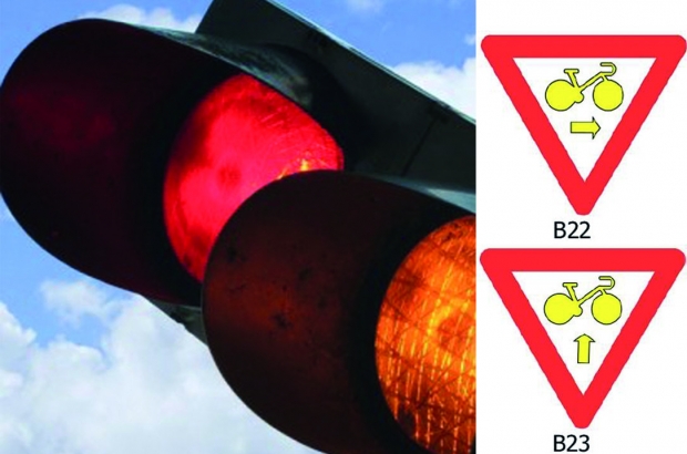 There are two different signs: B22 and B23. The B22 sign allows cyclists to ride through the red light at an intersection, and to turn right. When there’s a B23 sign, however, cyclists may ride through a red or yellow light, but do not have priority.