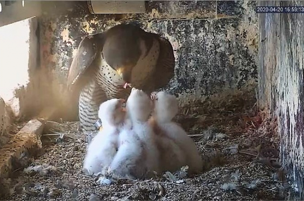 There were four eggs in Uccle as well, all of which hatched. A livestream of both the falcon families can be followed on the Falcons for Everyone website. The fuzzy, peeping chicks in Uccle (pictured) are particularly cute at the moment. The Uccle falcon couple have been brooding in the same spot in the tower for five years.