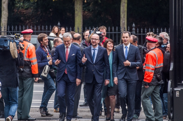 Photo, from left: Kris Peeters, Charles Michel, Jacqueline Galant and Alexander De Croo enter the palace on Saturday to be sworn in